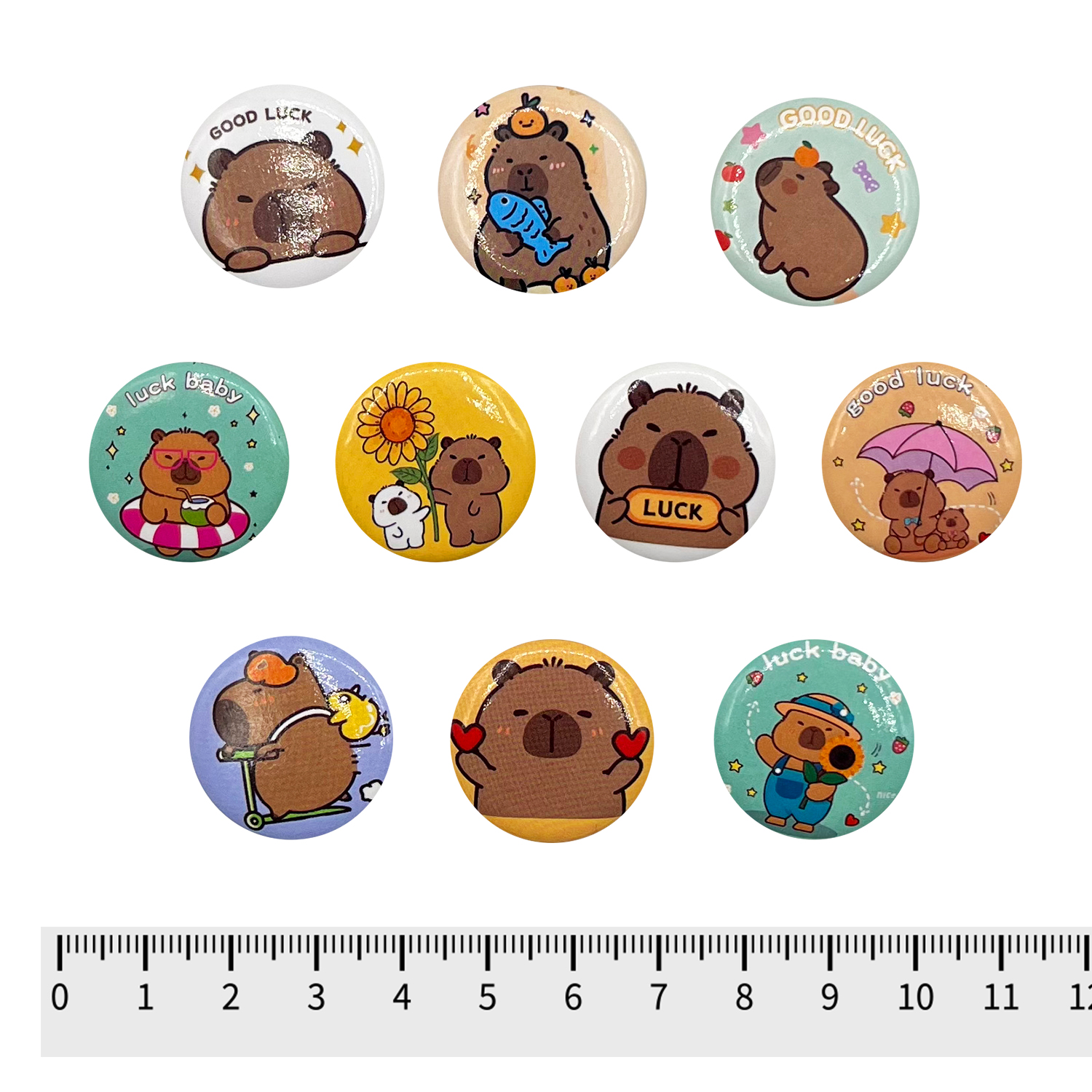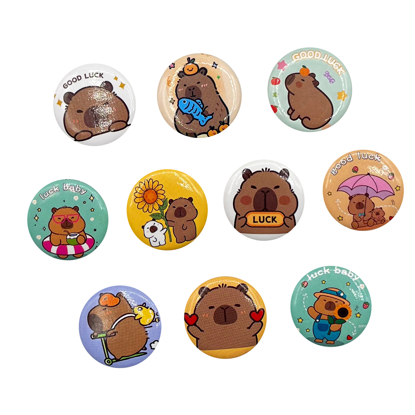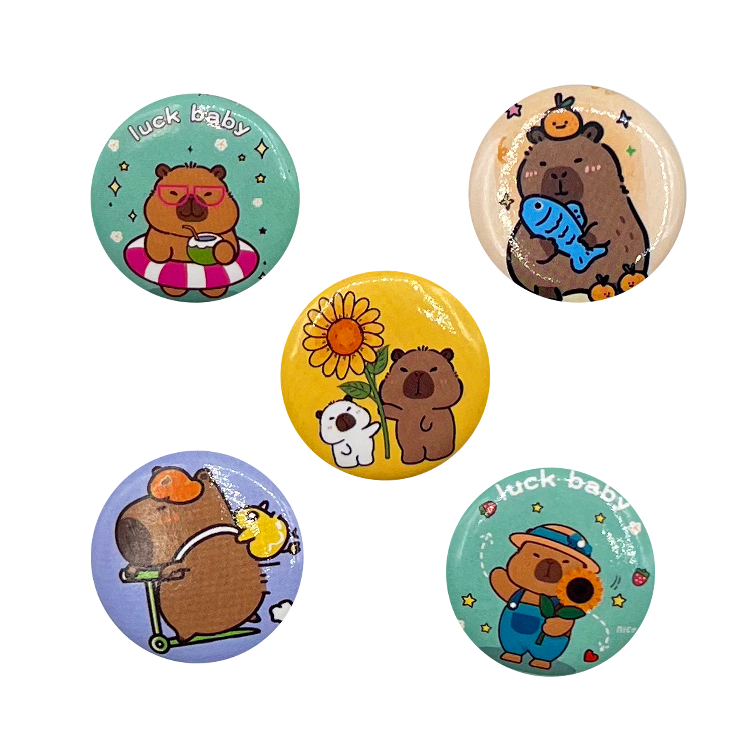 Оригинальные значки на современную тему флегматичных капибар. Идеальны для фасовки в маленькие капсулы.
