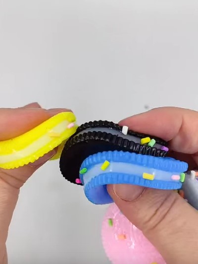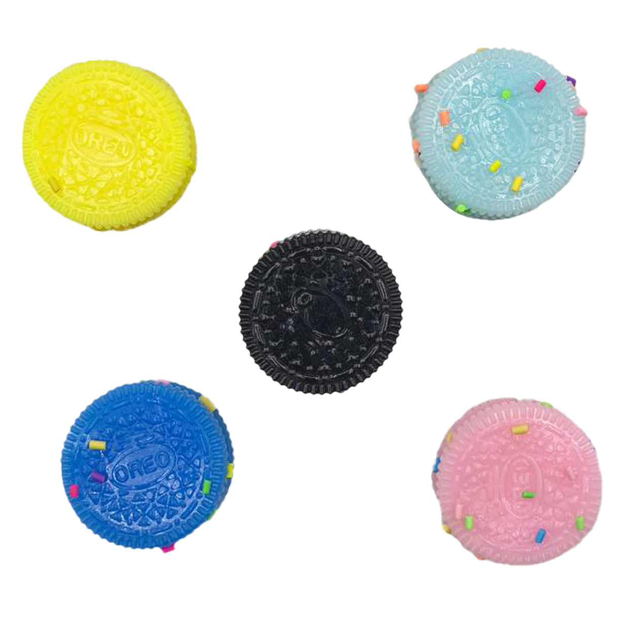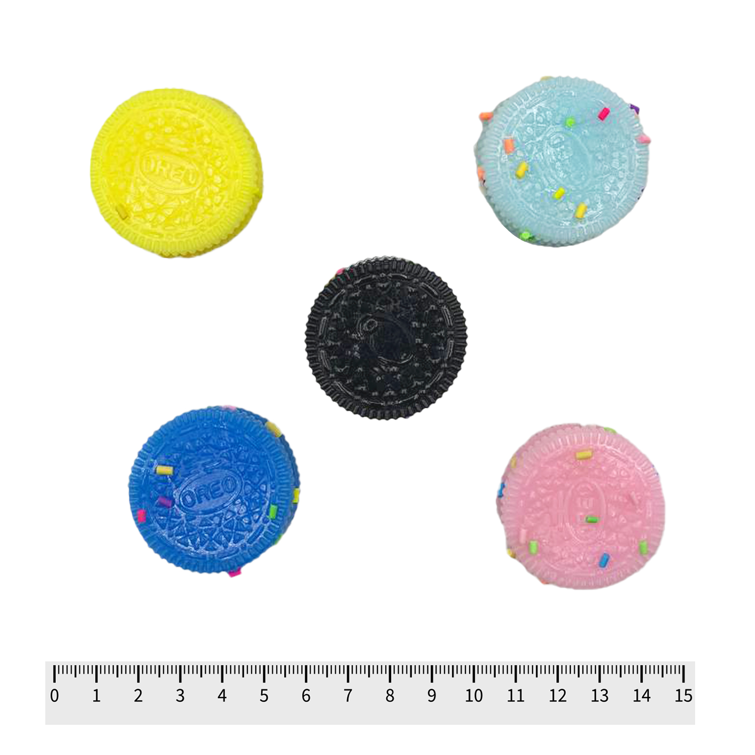 В одном пакете 5 цветов одной модели сквишей в виде печенек Орео в индивидуальной упаковке.