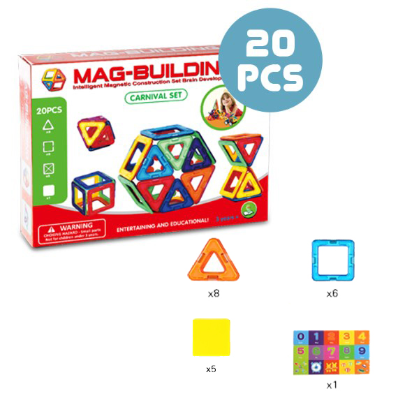 В комплектацию входит: - магнитные квадраты - 5 штук - магнитные треугольники малые - 8 штук - магнитные треугольники средние - 6 штуки - магнитные