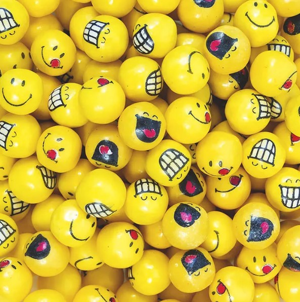 Солнечно-желтые смайлы: виноград, апельсин, клубника.