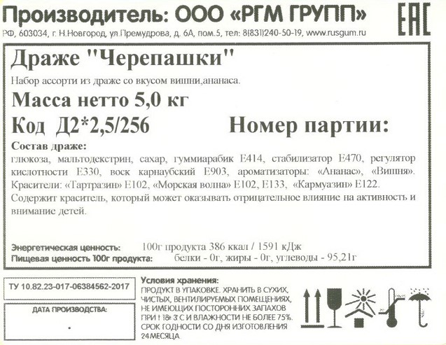 Сыпучие конфеты являются порционным товаром, поэтому точное количество в коробке может варьироваться в связи с разным весом одной конфетки. В каждой коробке приблизительно по 4200 конфет.