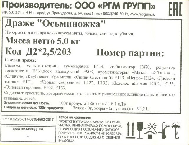 Сыпучие конфеты являются порционным товаром, поэтому точное количество в коробке может варьироваться в связи с разным весом одной конфетки. В каждой коробке приблизительно по 2950 конфет.