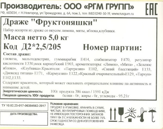 Сыпучие конфеты являются порционным товаром, поэтому точное количество в коробке может варьироваться в связи с разным весом одной конфетки. В каждой коробке приблизительно по 5555 конфет.