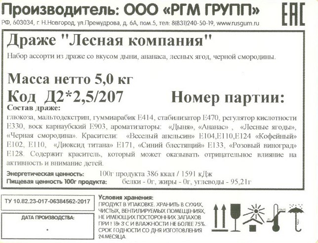 Сыпучие конфеты являются порционным товаром, поэтому точное количество в коробке может варьироваться в связи с разным весом одной конфетки. В каждой коробке приблизительно по 5555 конфет.