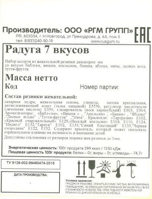 Жевательная резинка от самого известного российского производителя сладкого наполнителя для торговых механических автоматов - Rusgum. Красочная по цветам глянцевая глазурь жевательной резинки замечательно держит форму и устойчива к температурным изменениям. Большое разнообразие фруктовых и ягодных вкусов несомненно порадуют и взрослого и ребенка. Жевательная резинка при покупке через торговые механические автоматы станет отличным поводом для соревнования детей по надуванию больших пузырей и создаст прекрасное настроение на целый день.