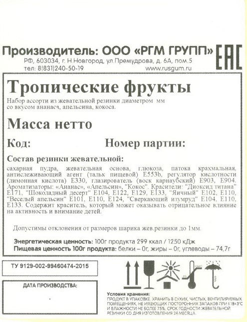 Жевательная резинка от самого известного российского производителя сладкого наполнителя для торговых механических автоматов - Rusgum. Красочная по цветам глянцевая глазурь жевательной резинки замечательно держит форму и устойчива к температурным изменениям. Большое разнообразие фруктовых и ягодных вкусов несомненно порадуют и взрослого и ребенка. Жевательная резинка при покупке через торговые механические автоматы станет отличным поводом для соревнования детей по надуванию больших пузырей и создаст прекрасное настроение на целый день.