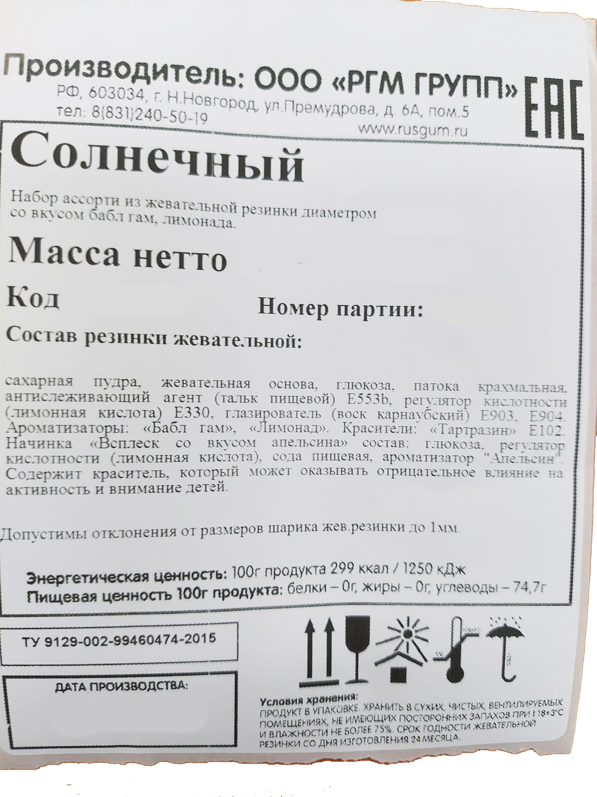 Жевательная резинка от самого известного российского производителя сладкого наполнителя для торговых механических автоматов - Rusgum. Красочная по цветам глянцевая глазурь жевательной резинки замечательно держит форму и устойчива к температурным изменениям. Большое разнообразие фруктовых и ягодных вкусов несомненно порадуют и взрослого и ребенка. Жевательная резинка при покупке через торговые механические автоматы станет отличным поводом для соревнования детей по надуванию больших пузырей и создаст прекрасное настроение на целый день.