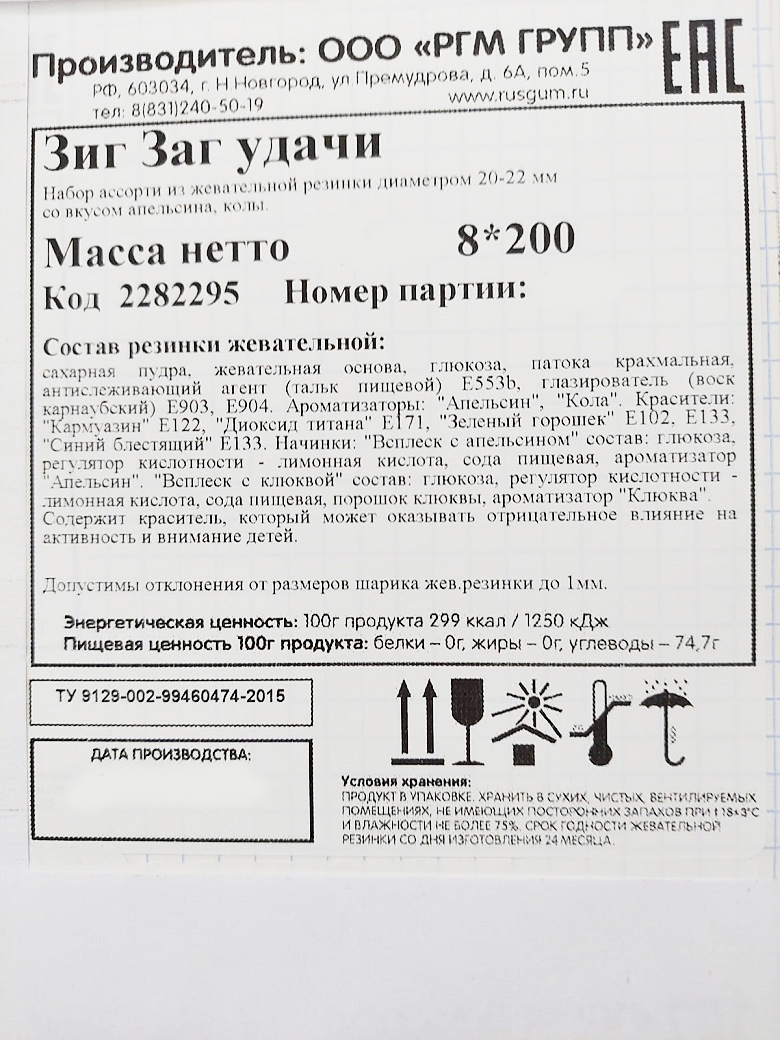 Жевательная резинка от самого известного российского производителя сладкого наполнителя для торговых механических автоматов - Rusgum. Красочная по цветам глянцевая глазурь жевательной резинки замечательно держит форму и устойчива к температурным изменениям. Большое разнообразие фруктовых и ягодных вкусов несомненно порадуют и взрослого и ребенка. Жевательная резинка при покупке через торговые механические автоматы станет отличным поводом для соревнования детей по надуванию больших пузырей и создаст прекрасное настроение на целый день.