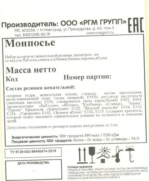 Жевательная резинка от самого известного российского производителя сладкого наполнителя для торговых механических автоматов - Rusgum. Красочная по цветам глянцевая глазурь жевательной резинки замечательно держит форму и устойчива к температурным изменениям. Большое разнообразие фруктовых и ягодных вкусов несомненно порадуют и взрослого и ребенка. Жевательная резинка при покупке через торговые механические автоматы станет отличным поводом для соревнования детей по надуванию больших пузырей и создаст прекрасное настроение на целый день.