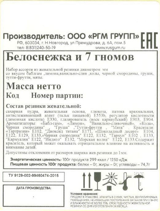 Жевательная резинка от самого известного российского производителя сладкого наполнителя для торговых механических автоматов - Rusgum. Красочная по цветам глянцевая глазурь жевательной резинки замечательно держит форму и устойчива к температурным изменениям. Большое разнообразие фруктовых и ягодных вкусов несомненно порадуют и взрослого и ребенка. Жевательная резинка при покупке через торговые механические автоматы станет отличным поводом для соревнования детей по надуванию больших пузырей и создаст прекрасное настроение на целый день.