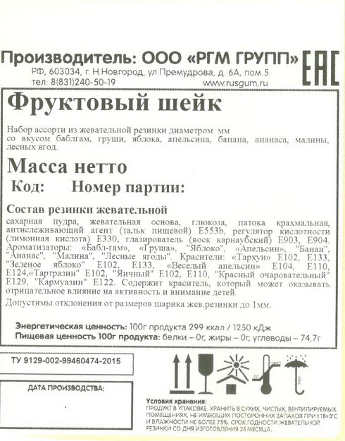 Жевательная резинка от самого известного российского производителя сладкого наполнителя для торговых механических автоматов - Rusgum. Красочная по цветам глянцевая глазурь жевательной резинки замечательно держит форму и устойчива к температурным изменениям. Большое разнообразие фруктовых и ягодных вкусов несомненно порадуют и взрослого и ребенка. Жевательная резинка при покупке через торговые механические автоматы станет отличным поводом для соревнования детей по надуванию больших пузырей и создаст прекрасное настроение на целый день.