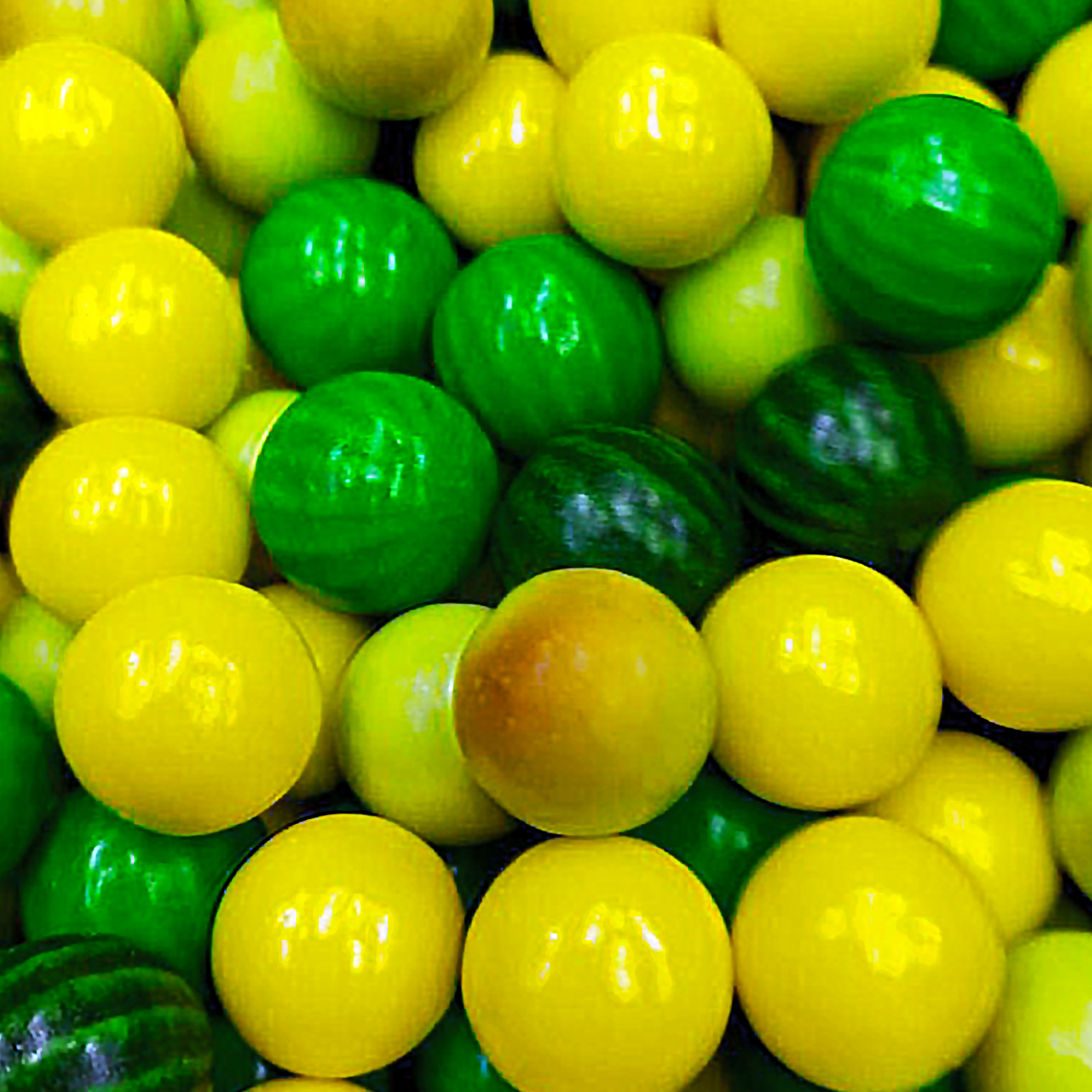 Желтая жвачка имеет бочек, напоминающий спелую дыню, а зеленая имеет рисунок, похожий на спелый арбуз.