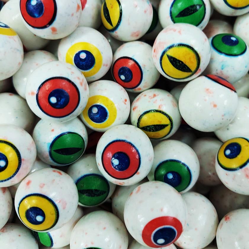 Белые шарики жвачки с красными брызгами.