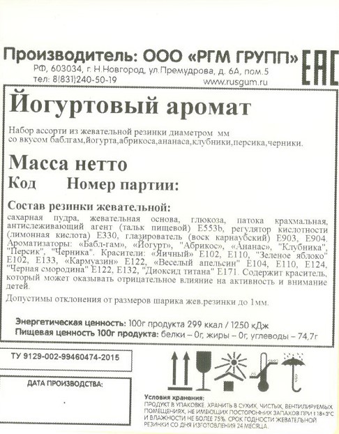 Вкус: йогурт с абрикосом, йогурт с ананасом, йогурт с клубникой, йогурт с персиком, йогурт с черникой