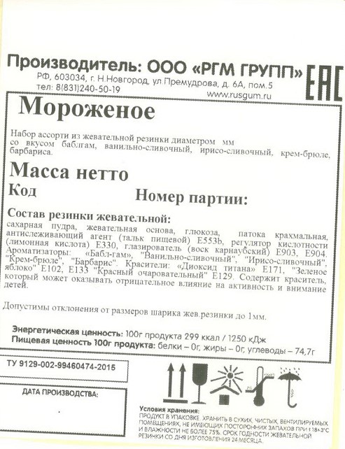 Состав: сахарная пудра, жевательная основа, патока, глюкоза, глицерин, лимонная кислота, ароматизаторы натуральные и идентичные натуральным, микротальк, красители пищевые, воск карнаубский, ГОСТ Р51561-2000.