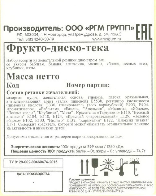 Жевательная резинка от самого известного российского производителя сладкого наполнителя для торговых механических автоматов - Rusgum. Красочная по цветам глянцевая глазурь жевательной резинки замечательно держит форму и устойчива к температурным изменениям. Большое разнообразие фруктовых и ягодных вкусов несомненно порадуют и взрослого и ребенка. Жевательная резинка при покупке через торговые механические автоматы станет отличным поводом для соревнования детей по надуванию больших пузырей и создаст прекрасное настроение на целый день.
