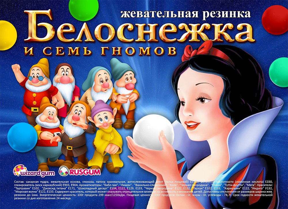 Главная фишка этой жеветельной резинки Белоснежка и 7 гномов - белая крупная горошина, выделяющаяся на фоне других более крупным размером. Она привлекает ребят к торговому автомату, наполненному именной этой разноцветной жевательной резинкой.