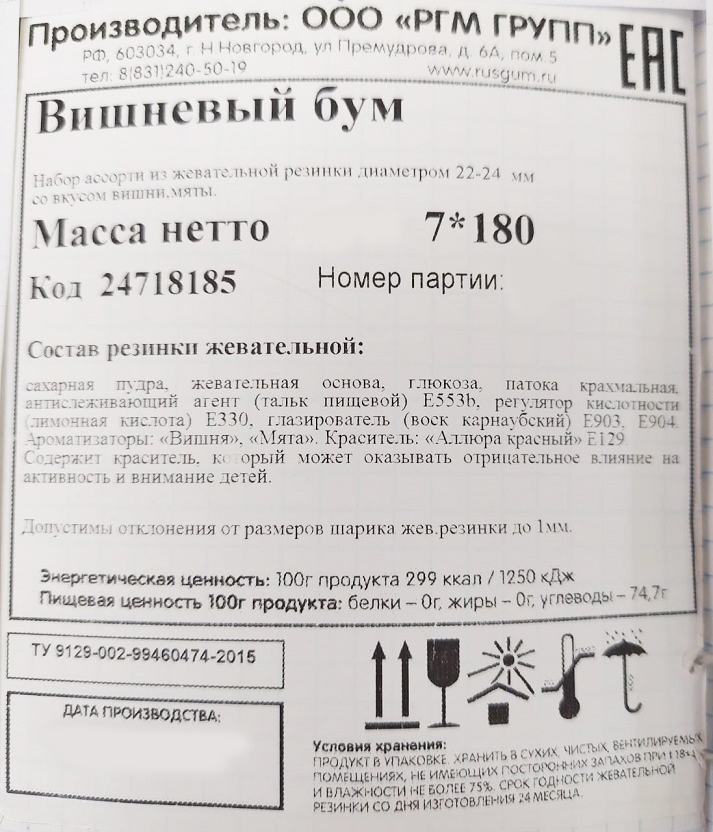 Жевательная резинка от самого известного российского производителя сладкого наполнителя для торговых механических автоматов - Rusgum. Красочная по цветам глянцевая глазурь жевательной резинки замечательно держит форму и устойчива к температурным изменениям. Большое разнообразие фруктовых и ягодных вкусов несомненно порадуют и взрослого и ребенка. Жевательная резинка при покупке через торговые механические автоматы станет отличным поводом для соревнования детей по надуванию больших пузырей и создаст прекрасное настроение на целый день.