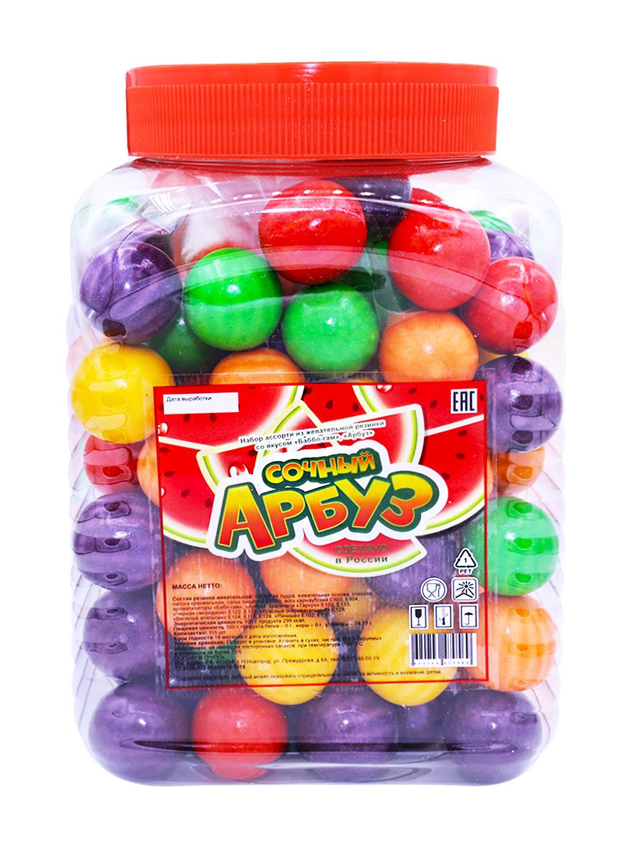 В одной банке 628 гр ассорти жвачки со вкусом арбуза.