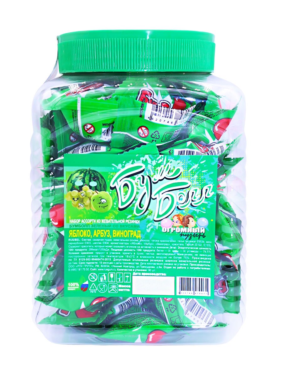 Бумбол зеленый флоу-пак 1 шт , 14 д : ассорти жевательной резинки со вкусами : яблоко, арбуз, виноград.