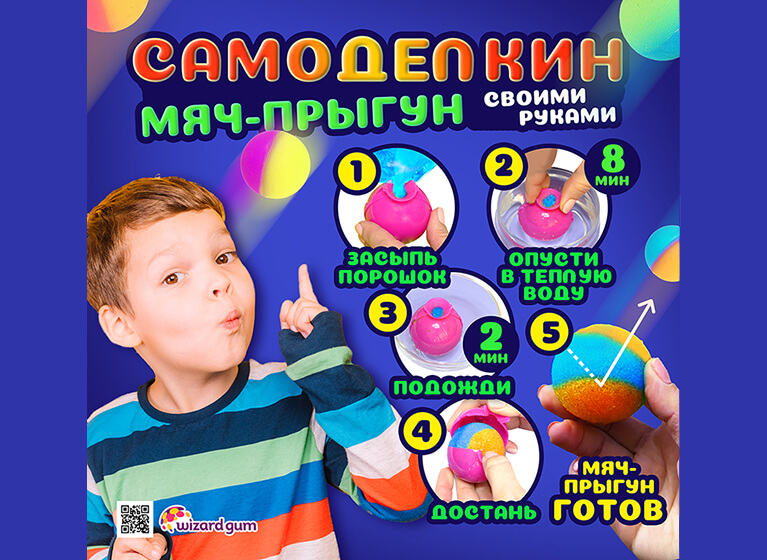 В упаковке набор из формочки и сыпучего материала для изготовления мяча. Все, что нужно – засыпать цветной порошок в формочку и заполнить ее водой. И вот в руках сделанный своими руками мяч-прыгун!