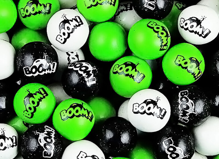 Новые жевательные резинки с принтом «Мега Бум» – это сочный микс сразу трех вкусов: вишня, кола и ананас! Загадочные цвета глазури (зеленый, черный и белый) не соответствуют вкусам, поэтому придется попробовать все, чтобы угадать кто есть кто. А ведь это целый повод для ваших маленьких покупателей делать повторные покупки!