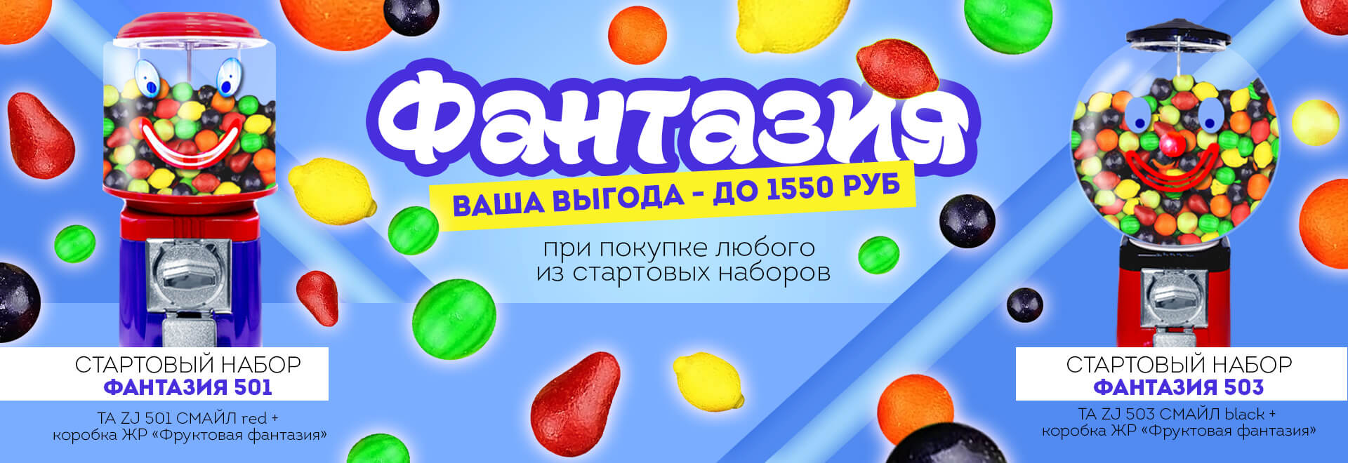 В наборе «Фантазия 503» коробка жвачки Rusgum «Фруктовая фантазия» и торговый автомат ZJ 503 СМАЙЛ black большой вместимости – объемом 0,065 куб.м.
