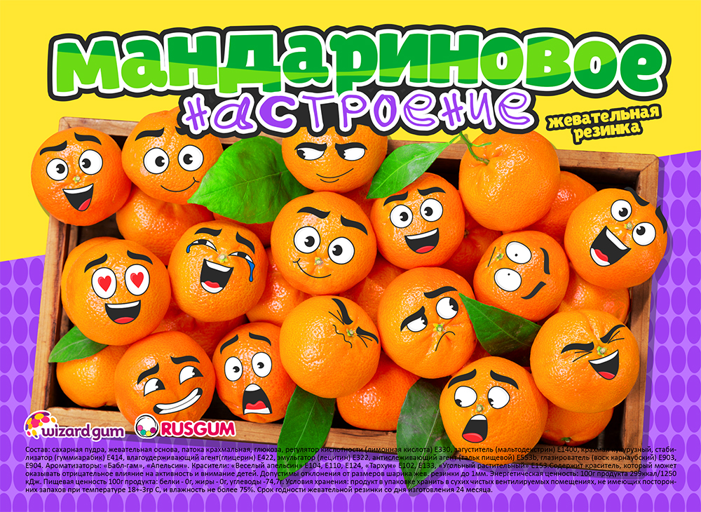 Сладкий аромат и яркий дизайн шоу-листа, рекомендованный для усиления продаж, сразу привлекают внимание, делая жевательную резинку «Мандариновое настроение» востребованным товаром.